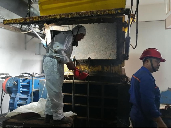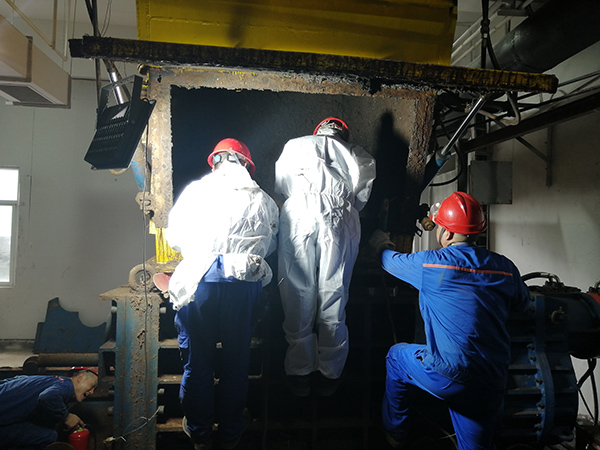 从事环保处置的同行大家都知道,进入破碎机机舱里面作业需要穿戴全副武装的作业服,面部佩戴多层活性炭过滤防护面具和安全头盔,在常态下,类似这种穿戴10分钟已经是大汗淋漓了,何况在闷热夏季而且进入密不透风的破碎机舱电焊施工作业,弥漫的是刺鼻恶心的恶臭味,因为机舱内电焊动火作业,防止火花飞溅,所以不能使用排风等辅助手段,王德成急企业所急,一干就是约二个小时,期间在现场领导催促下,几次短暂出仓休息喝水,一直完成抢修结束,当王德成脱下防护服时,整个人完全是从水里捞出来的,汗水已经浸透了他的工作服……